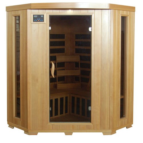The Harvil Tranquility 3-Person Hemlock Corner Sauna with Carbon Infrared Heaters fits conveniently in the corner of the room and its infrared heat technology safely and effectively alleviates pain, improves joint mobility, relieves stress and promotes weight loss! With safe, solid hemlock wood construction and seven superior carbon heaters, this sauna is built to provide years of health benefits and relaxation. This sauna comfortably seats three people and features a built-in cd/radio player and mp3 plug-in with two built-in speakers, ergonomic back rests, adjustable vent, cup holders, magazine rack, color therapy light, and an oxygen ionizer for the ultimate in convenience and relaxation. Theres even a dual touch control panel on the interior and exterior for easy adjustment whether youre inside or out! The Harvil Tranquility 3-Person Corner Sauna fits well in virtually any room and is backed by the manufacturers 18-month warranty. So invest in yourself this year with the latest innovation in health and wellbeing. Read more...