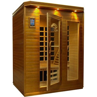 Three Person Sauna LuxSpa's Elite models provide our unique and effective Free Flow heat circulation. This bench design allows for optimal far infrared heat circulation throughout, allowing penetration to the lower back, buttocks, legs and thighs. 7 Black Bio Spectrum Carbon Heaters - 4 Heaters on back wall 2 Heaters under the bench 1 Heater on each side panel. Our pure 100pct Carbon Fiber surround heaters emit the greatest spectral distribution of beneficial infrared heat on a 7-14 micron level, and are the only heaters with extensive proof demonstrated in many clinical trials for providing the most beneficial effects. Sauna Features: -Combination of Tan and Brown color. -Wood construction. -CD music player with AM-FM and speakers. -Ergonomic, free-flow contoured backrests. -Provides more support and comfort. -Allows optimal deep penetration. -Far infrared heat circulation. -Bio spectrum carbon technology heaters. -Tempered glass window. -120Volts. -13.34AMPS. -1600 Watts. -Infrared Lighting. -Operating Temperature Room Temp to 151 F. -Internal Lighting. -Internal Digital Control. -External Digital Control. -Includes Oxygen Ionizer. -Provides an oxygen environment. -Expedites detox and kills bacteria for Self Cleaning benefits. -Highest Quality materials, workmanship and finish. -With Tongue and Groove Walls made with precision craftsmanship. -100pct Non-toxic water based glues used. -Assembly required. Specifications: -Manufacturer provides 1 year warranty on electronics. -Overall dimensions: 76''-77.2'' H x 61'' W x 39.4'' D. Sauna Cover Features: -Combination of Tan and Brown color. -Naugahyde construction. -Roll up for door opening. -Protects wood and sauna. -Manufacturer provides 3 year warranty. Read more...
